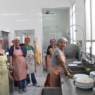 Cida: Foi muito legal quando formamos a equipe. É uma equipe que tem a função de cuidar, servir as pessoas que estão servindo nas várias frentes do jantar. Os voluntários vêm, se servem e saem com as energias renovadas para continuar a servir ali onde estão atuando. É um momento bem alegre também pois chegam, conversam um pouco e se alimentam.